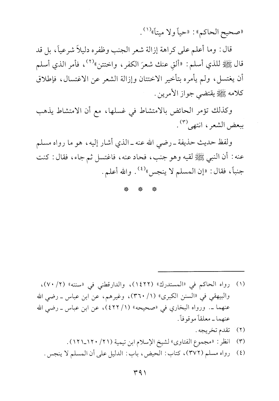 ولفظ حديث حذيفة - رضي الله عنه - الذي أشار إليه، هو ما رواه مسلم عنه: أن النبي - صلى الله عليه وسلم - لقيه وهو جنب، فحاد عنه، فاغتسل أجاء، فقال: كنت جنباً، فقال: "إن المسلم لا ينجس" (٤). والله أعلم.