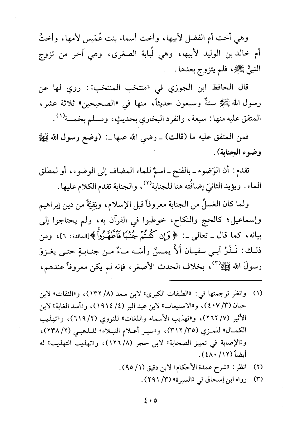 ولما كان الغسلُ من الجنابة معروفا قبل الإسلام، وبَقِيّهً من دين إبراهيم وإسماعيل؛ كالحج والنكاح، خوطبوا في القرآن به، ولم يحتاجوا إلى بيانه، كما قال- تعالى-: {وَإِنْ كُنْتُمْ جُنُبًا فَاطَّهَّرُوا} [المائدة: ٦]، ومن ذلك: نَذْرُ أبي سفيان أَلَّا يمسَّ رأسَه ماءُ من جنابةٍ حتى يغزوَ رسولَ الله - صلى الله عليه وسلم - (٣)، بخلاف الحدث الأصغر، فإنه لم يكن معروفاً عندهم،