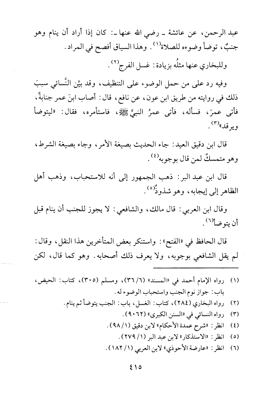 وقال ابن العربي: قال مالك، والشافعي: لا يجوز للجنب أن ينام قبل أن يتوضأ (٦).