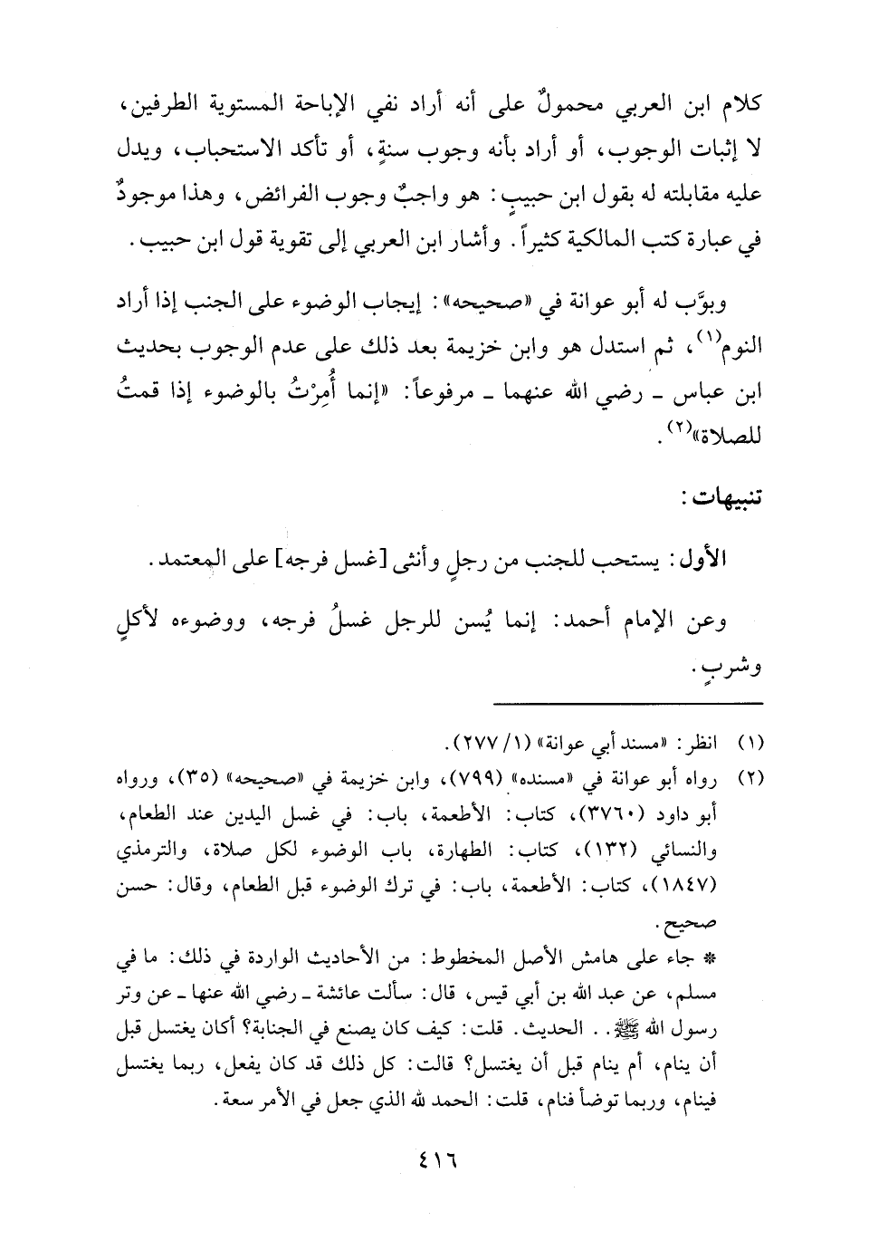* جاء على هامش الأصل المخطوط: من الأحاديث الواردة في ذلك: ما في مسلم، عن عبد الله بن أبي قيس، قال: سألت عائشة - رضي الله عنها - عن وتر رسول الله - صلى الله عليه وسلم - .. الحديث. قلت: كيف كان يصنع في الجنابة؟ أكان يغتسل قبل أن ينام، أم ينام قبل أن يغتسل؟ قالت: كل ذلك قد كان يفعل، ربما يغتسل فينام، وربما توضأ فنام، قلت: الحمد لله الذي جعل في الأمر سعة.