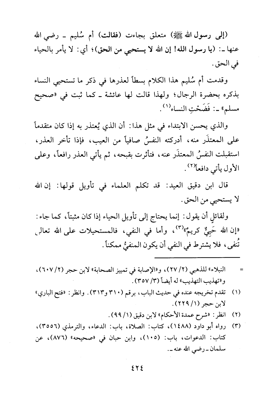 قال ابن دقيق العيد: قد تكلم العلماء في تأويل قولها: إن الله لا يستحيي من الحق.
