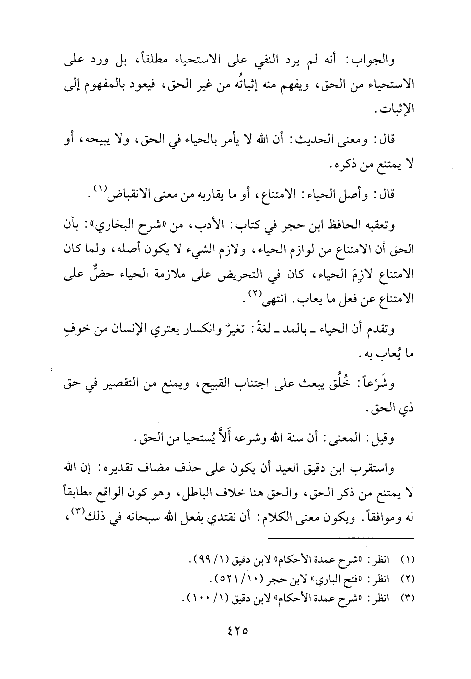 واستقرب ابن دقيق العيد أن يكون على حذف مضاف تقديره: إن الله لا يمتنع من ذكر الحق، والحق هنا خلاف الباطل، وهو كون الواقع مطابقًا له وموافقًا. ويكون معنى الكلام: أن نقتدي بفعل الله سبحانه في ذلك (٣)،