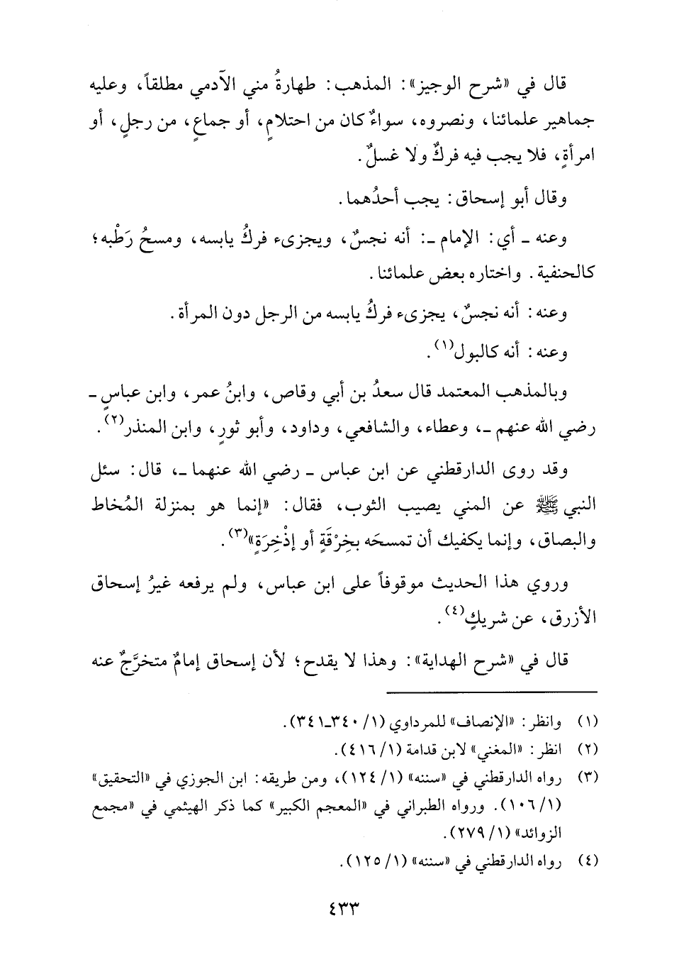 وقد روى الدارقطني عن ابن عباس - رضي الله عنهما -، قال: سئل النبي - صلى الله عليه وسلم - عن المني يصيب الثوب، فقال: "إنما هو بمنزلة المُخاط والبصاق، وإنما يكفيك أن تمسحَه بخِرْقَةٍ أو إذْخِرَةٍ" (٣).