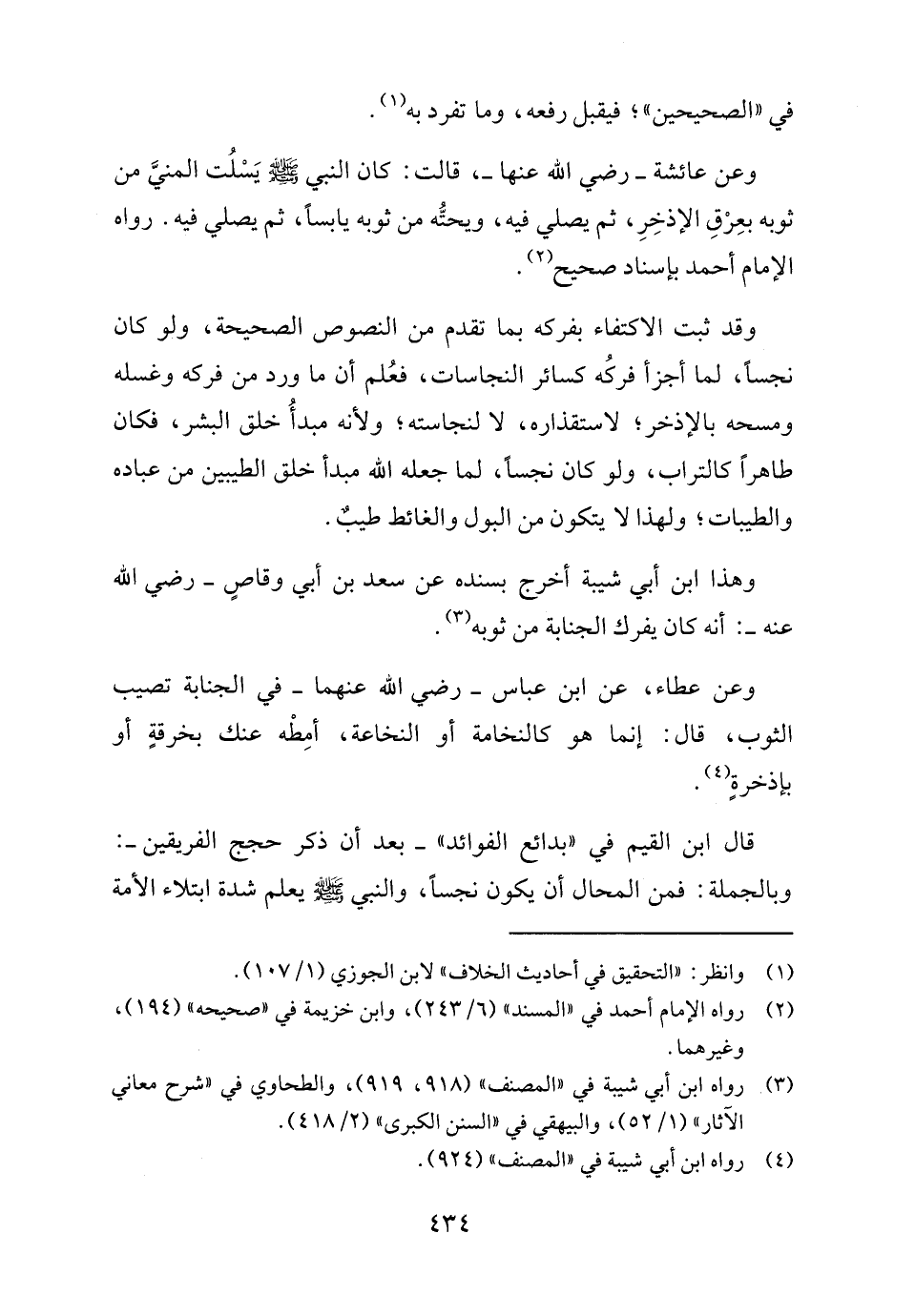 وعن عائشة - رضي الله عنها -، قالت: كان النبي - صلى الله عليه وسلم - يَسْلُت المنيَّ من ثوبه بعِرْقِ الإذخِرِ، ثم يصلي فيه، ويحتُّه من ثوبه يابسًا، ثم يصلي فيه. رواه الإمام أحمد بإسناد صحيح (٢).