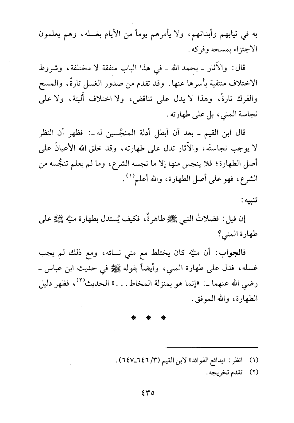 قال: والآثار -بحمد الله- في هذا الباب متفقة لا مختلفة، وشروط الاختلاف منتفية بأسرها عنها. وقد تقدم من صدور الغسل تارةً، والمسح والفرك تارةً، وهذا لا يدل على تناقض، ولا اختلاف أَلبتة، ولا على نجاسة المني، بل على طهارته.