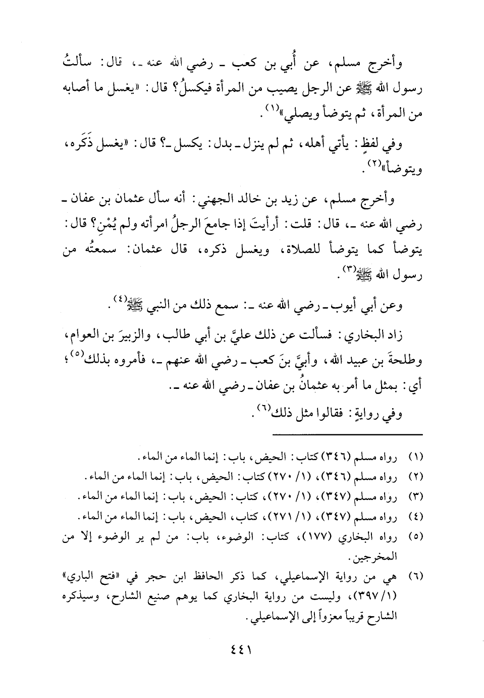 (٢) رواه مسلم (٣٤٦)، (١/ ٢٧٠) كتاب: الحيض، باب: إنما الماء من الماء.