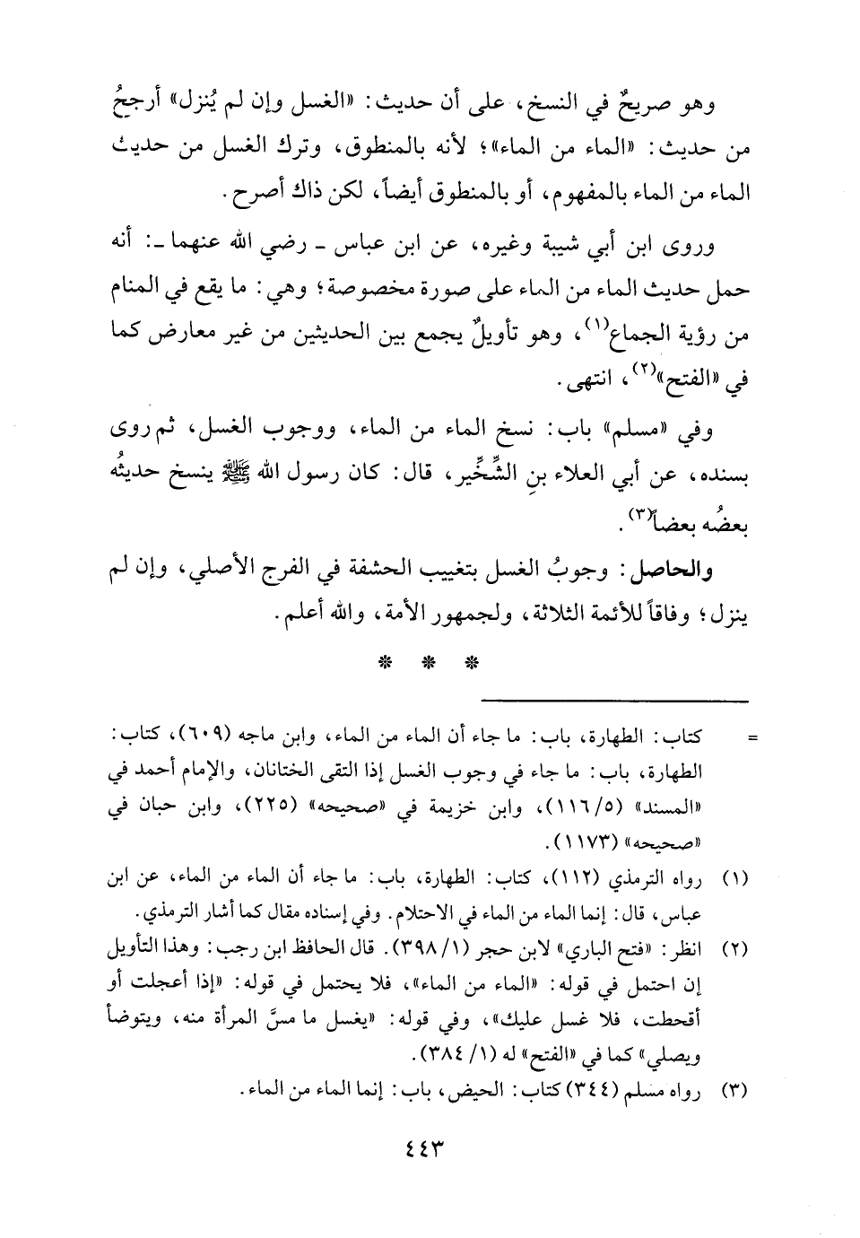 (٢) انظر: "فتح الباري" لابن حجر (١/ ٣٩٨). قال الحافظ ابن رجب: وهذا التأويل إن احتمل في قوله: "الماء من الماء"، فلا يحتمل في قوله: "إذا أعجلت أو أقحطت، فلا غسل عليك"، وفي قوله: "يغسل ما مسَّ المرأة منه، ويتوضأ ويصلي" كما في "الفتح" له (١/ ٣٨٤).