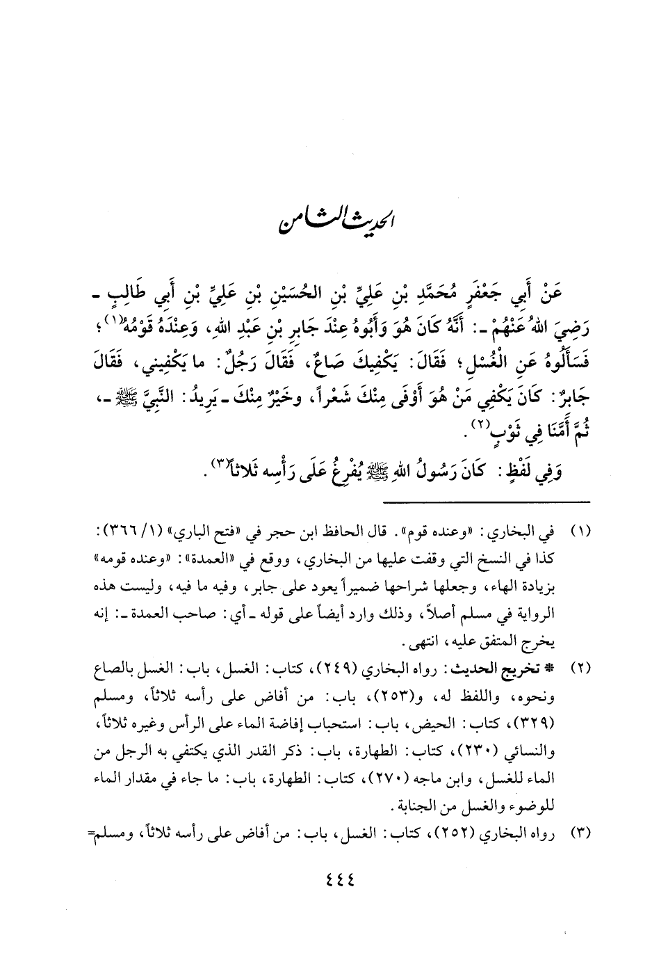 (٣) رواه البخاري (٢٥٢)، كتاب: الغسل، باب: من أفاض على رأسه ثلاثًا، ومسلم =