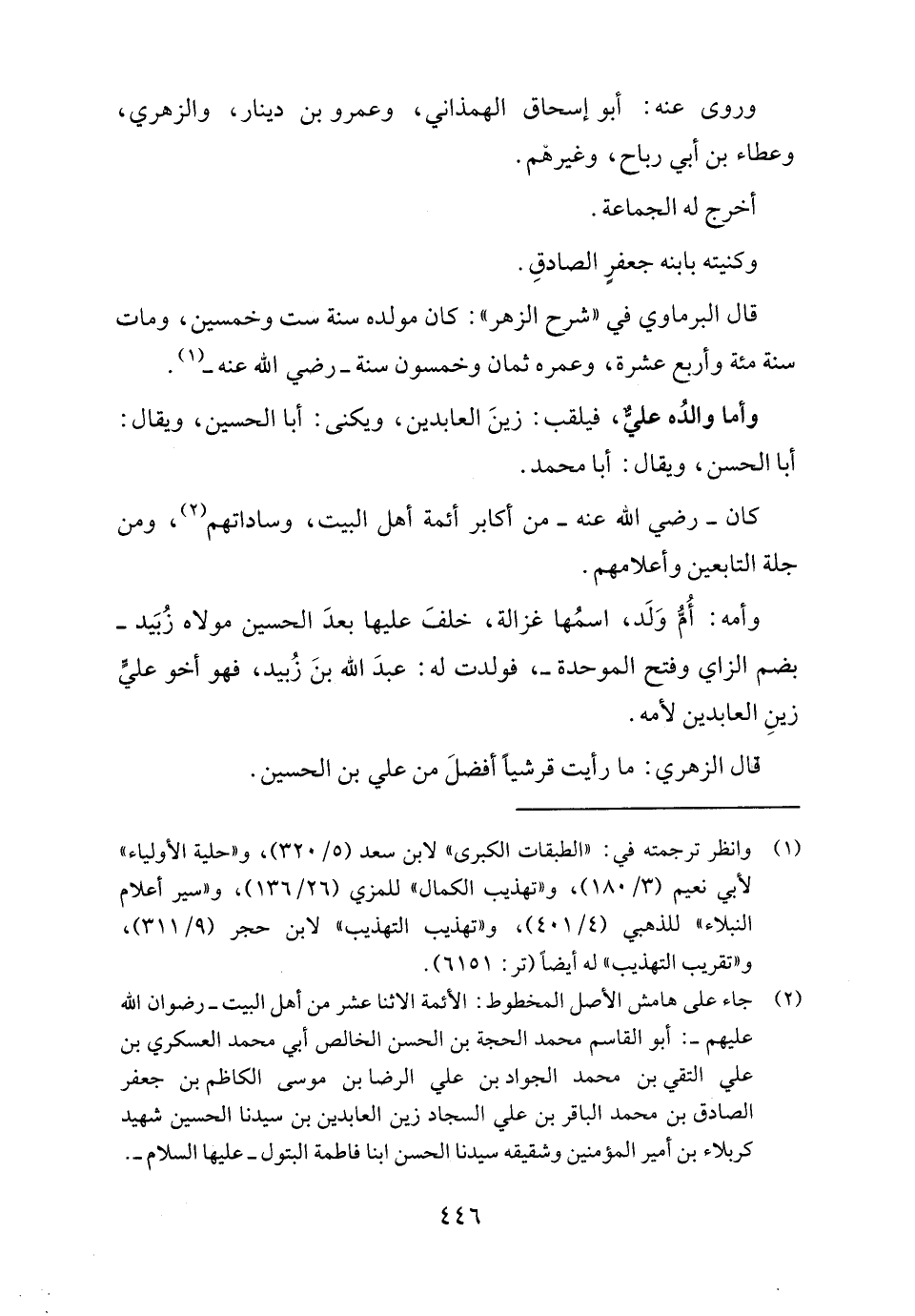 كان - رضي الله عنه - من أكابر أئمة أهل البيت، وساداتهم (٢)، ومن جلة التابعين وأعلامهم.