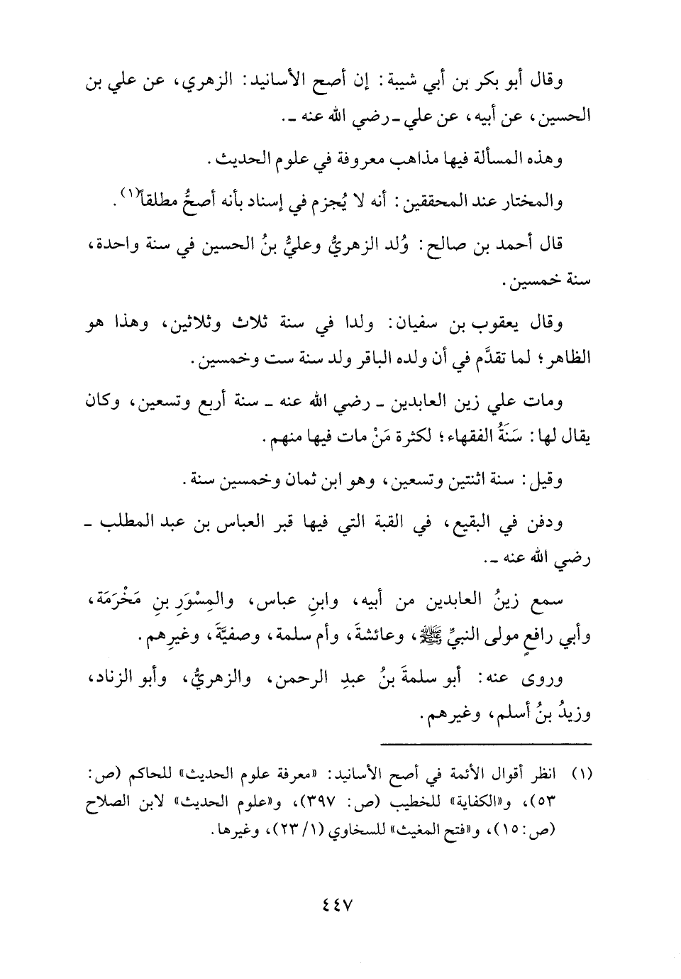 وقال أبو بكر بن أبي شيبة: إن أصح الأسانيد: الزهري، عن علي بن الحسين، عن أبيه، عن علي - رضي الله عنه -.
