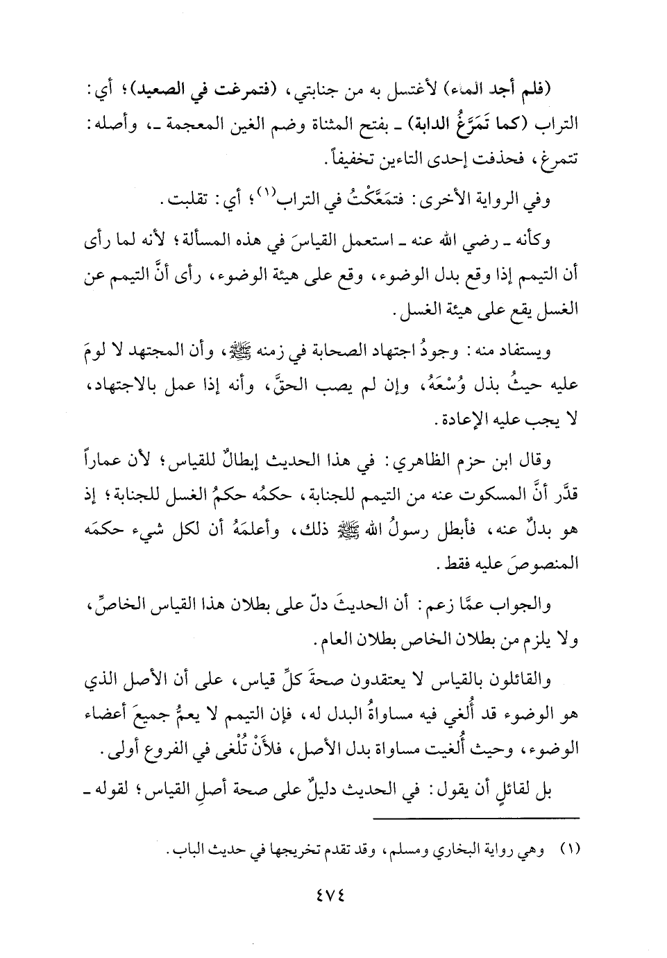 وقال ابن حزم الظاهري: في هذا الحديث إبطالٌ للقياس؛ لأن عمارًا قدَّر أنَّ المسكوت عنه من التيمم للجنابة، حكمُه حكمُ الغسل للجنابة؛ إذ هو بدل عنه، فأبطل رسولُ الله - صلى الله عليه وسلم - ذلك، وأعلمَهُ أن لكل شيء حكمَه المنصوصَ عليه فقط.