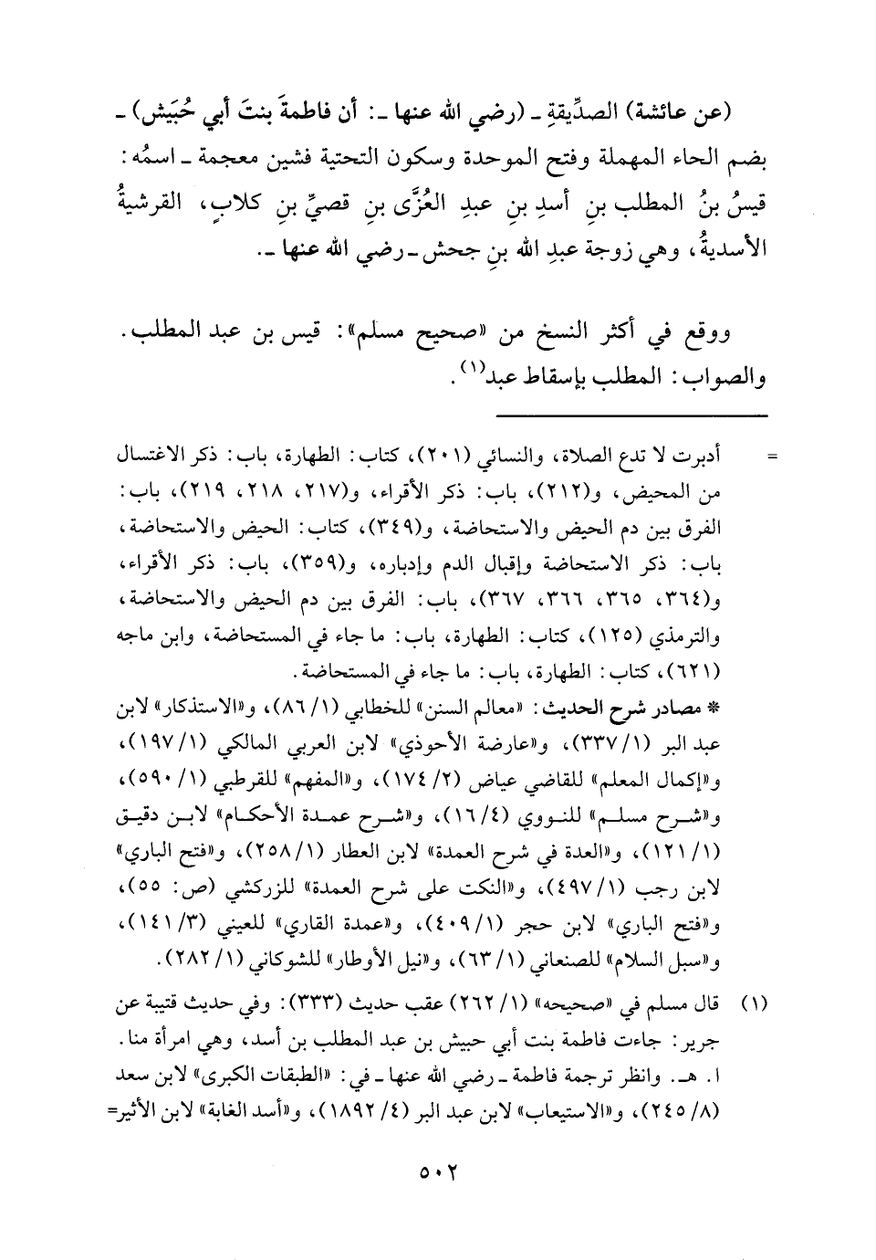(١) قال مسلم في "صحيحه" (١/ ٢٦٢) عقب حديث (٣٣٣): وفي حديث قتيبة عن جرير: جاءت فاطمة بنت أبي حبيش بن عبد المطلب بن أسد، وهي امرأة منا. ا. هـ. وانظر ترجمة فاطمة - رضي الله عنها - في: "الطبقات الكبرى" لابن سعد (٨/ ٢٤٥)، و"الاستيعاب" لابن عبد البر (٤/ ١٨٩٢)، و"أسد الغابة" لابن الأثير =