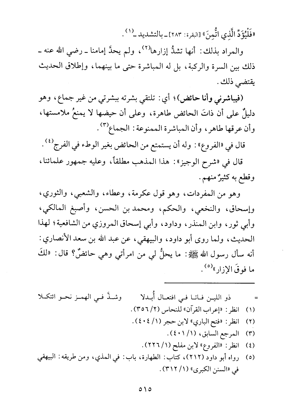 وهو من المفردات، وهو قول عكرمة، وعطاء، والشعبي، والثوري، وإسحاق، والنخعي، والحكم، ومحمد بن الحسن، وأصبغ المالكي، وأبي ثور، وابن المنذر، وداود، وأبي إسحاق المروزي من الشافعية؛ لهذا الحديث، ولما روى أبو داود، والبيهقي، عن عبد الله بن سعد الأنصاري: أنه سأل رسول الله - صلى الله عليه وسلم -: ما يحلّ لي من امرأتي وهي حائضٌ؟ قال: "لكَ ما فوقَ الإزار" (٥).