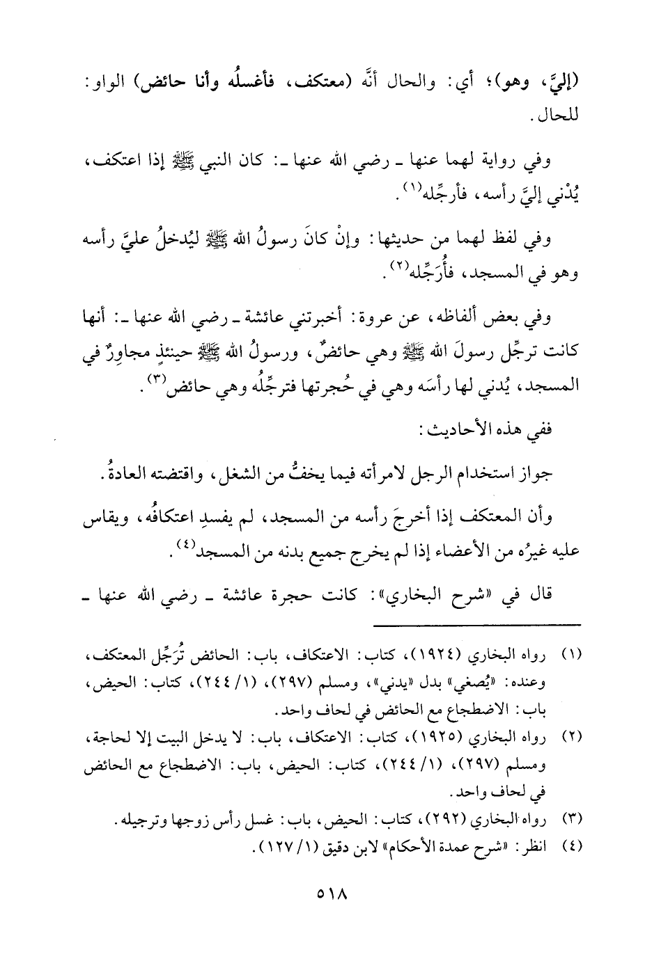 وفي بعض ألفاظه، عن عروة: أخبرتني عائشة - رضي الله عنها -: أنها كانت ترجِّل رسولَ الله - صلى الله عليه وسلم - وهي حائضٌ، ورسولُ الله - صلى الله عليه وسلم - حينئذٍ مجاوِرٌ في المسجد، يُدني لها رأسَه وهي في حُجرتها فترجِّلُه وهي حائض (٣).