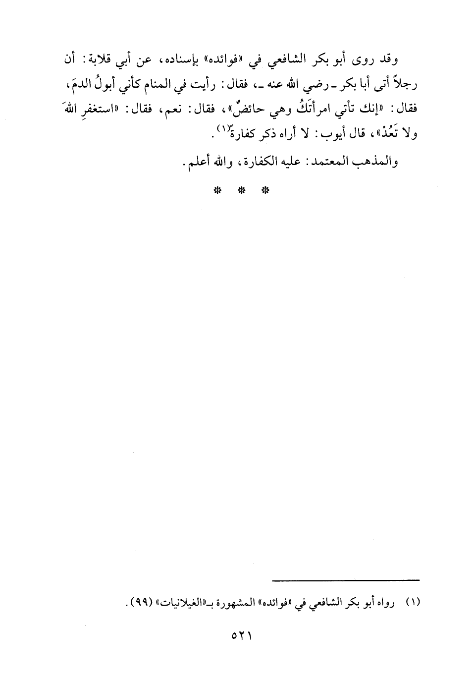 وقد روى أبو بكر الشافعي في "فوائده" بإسناده، عن أبي قلابة: أن رجلًا أتى أبا بكر - رضي الله عنه -، فقال: رأيت في المنام كأني أبولُ الدمَ، فقال: "إنك تأتي امرأتَكُ وهي حائض"، فقال: نعم، فقال: "استغفرِ اللهَ ولا تَعُدْ"، قال أيوب: لا أراه ذكر كفارةً (١).