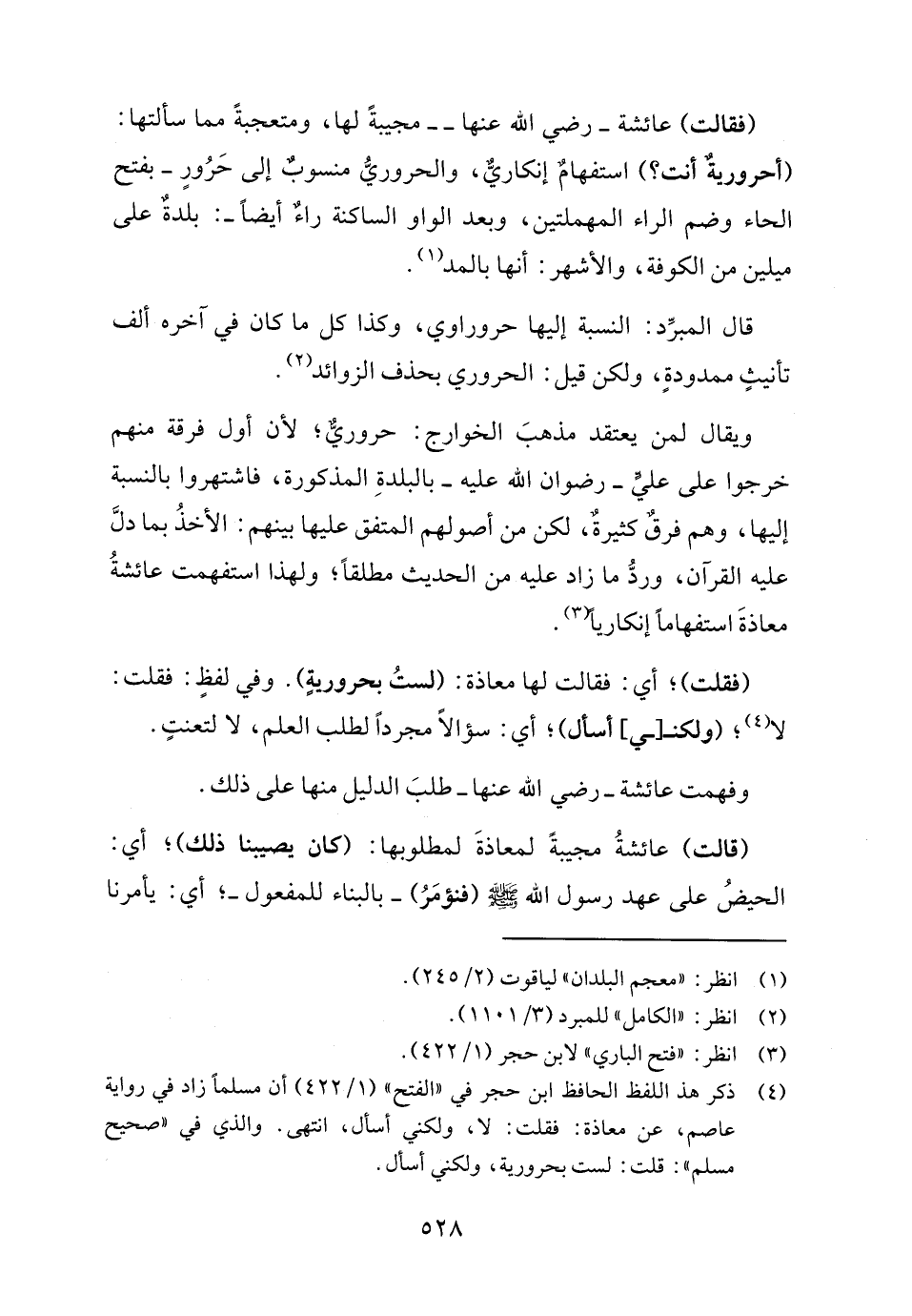 ويقال لمن يعتقد مذهبَ الخوارج: حروريٌّ؛ لأن أول فرقة منهم خرجوا على علي - رضوان الله عليه - بالبلدةِ المذكورة، فاشتهروا بالنسبة إليها، وهم فرقٌ كثيرةٌ، لكن من أصولهم المتفق عليها بينهم: الأخذُ بما دلَّ عليه القرآن، وردُّ ما زاد عليه من الحديث مطلقًا؛ ولهذا استفهمت عائشةُ معاذةَ استفهامًا إنكاريا (٣).