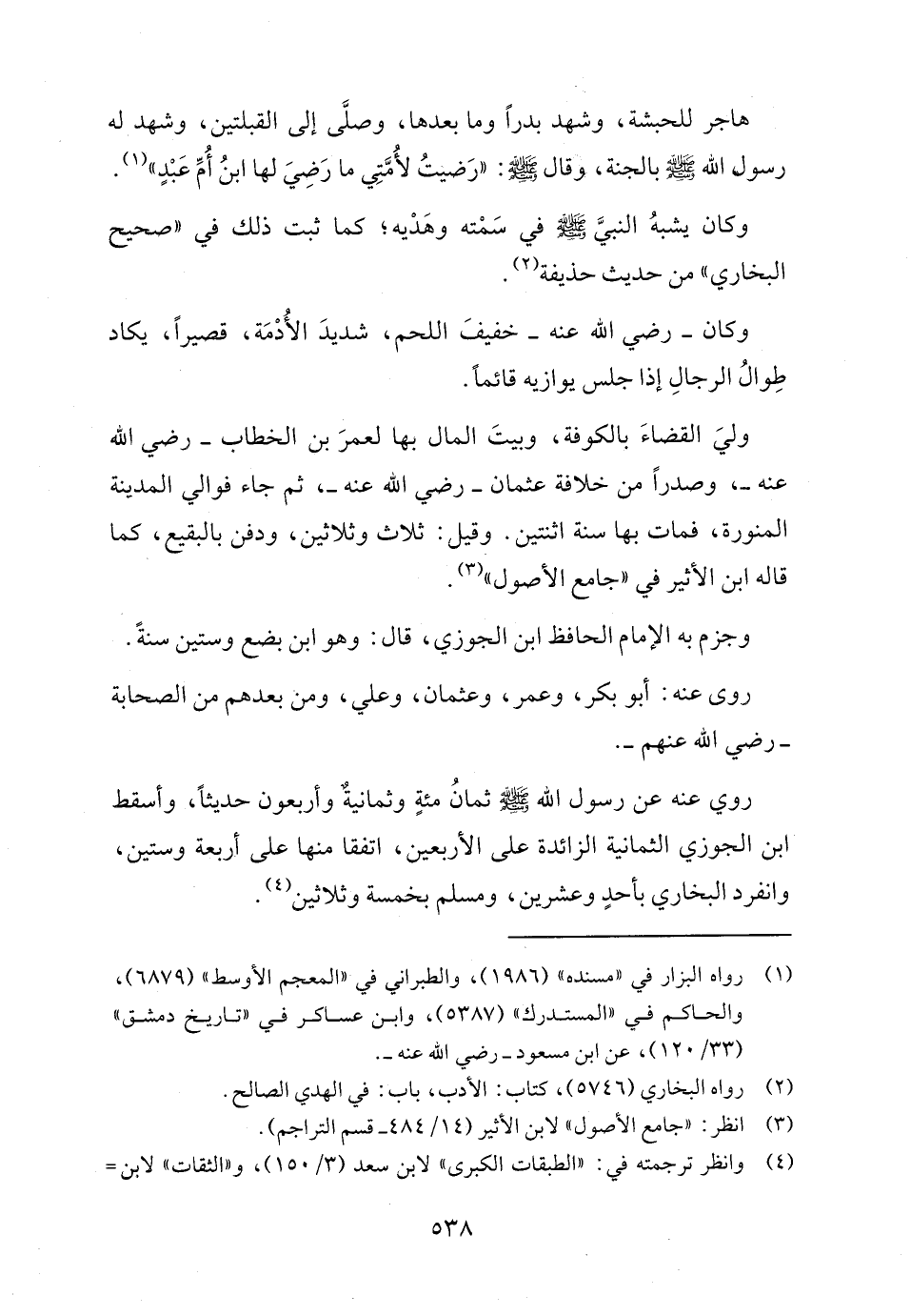 هاجر للحبشه، وشهد بدرًا وما بعدها، وصلَّى إلى القبلتين، وشهد له رسول الله - صلى الله عليه وسلم - بالجنة، وقال - صلى الله عليه وسلم -: "رَضيتُ لأُمَّتِي ما رَضِيَ لها ابنُ أُمِّ عَبْدٍ" (١).