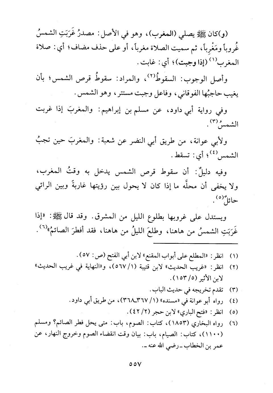 ويستدل على غروبها بطلوع الليل من المشرق. وقد قال - صلى الله عليه وسلم -: "إذا غَرَبَتِ الشمسُ من هاهنا، وطلعَ الليلُ من هاهنا، فقد أفطرَ الصائمُ" (٦).