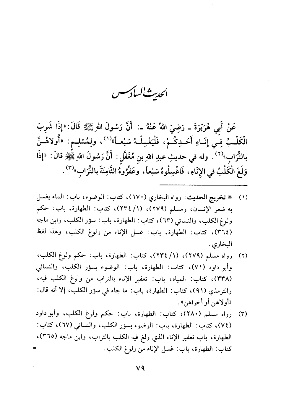 (٣) رواه مسلم (٢٨٠)، كتاب: الطهارة، باب: حكم ولوغ الكلب، وأبو داود (٧٤)، كتاب: الطهارة، باب: الوضوء بسؤر الكلب، والنسائي (٦٧)، كتاب: الطهارة، باب تعفير الإناء الذي ولغ فيه الكلب بالتراب، وابن ماجه (٣٦٥)، كتاب: الطهارة، باب: غسل الإناء من ولوغ الكلب. =