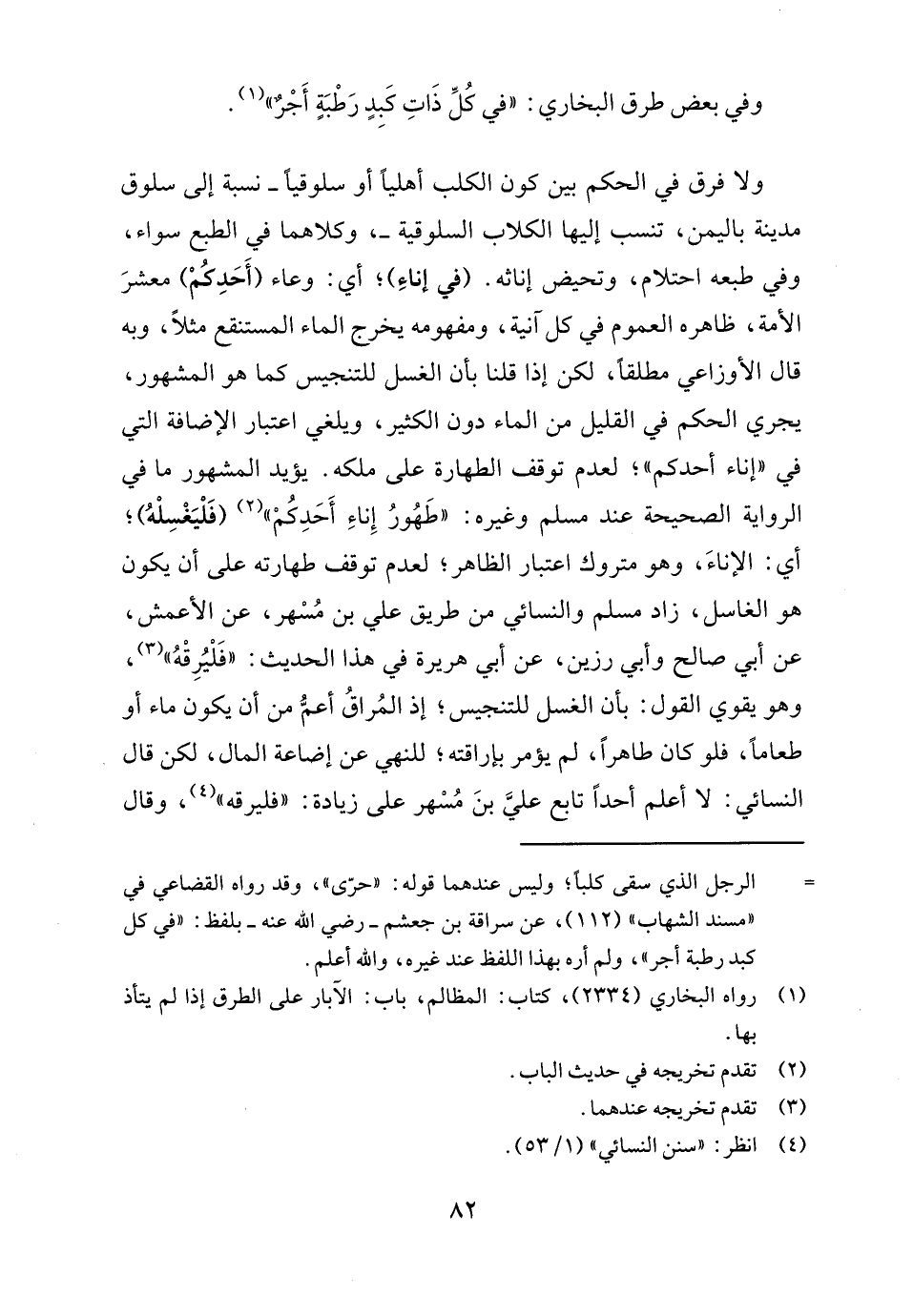 ولا فرق في الحكم بين كون الكلب أهلياً أو سلوقياً- نسبة إلى سلوق مدينة باليمن، تنسب إليها الكلاب السلوقية -، وكلاهما في الطبع سواء، وفي طبعه احتلام، وتحيض إناثه. (في إناءِ)؛ أي: وعاء (أَحَدِكمْ) معشرَ الأمة، ظاهره العموم في كل آنية، ومفهومه يخرج الماء المستنقع مثلاً، وبه قال الأوزاعي مطلقاً، لكن إذا قلنا بأن الغسل للتنجيس كما هو المشهور، يجري الحكم في القليل من الماء دون الكثير، ويلغي اعتبار الإضافة التي في "إناء أحدكم"؛ لعدم توقف الطهارة على ملكه. يؤيد المشهور ما في الرواية الصحيحة عند مسلم وغيره: "طَهُورُ إِناءِ أَحَدِكُمْ" (٢) (فَلْيَغْسِلْهُ)؛ أي: الإناءَ، وهو متروك اعتبار الظاهر؛ لعدم توقف طهارته على أن يكون هو الغاسل، زاد مسلم والنسائي من طريق علي بن مُسْهر، عن الأعمش، عن أبي صالح وأبي رزين، عن أبي هريرة في هذا الحديث: "فَلْيُرِقْهُ" (٣)، وهو يقوي القول: بأن الغسل للتنجيس؛ إذ المُراقُ أعمُّ من أن يكون ماء أو طعاماً، فلو كان طاهراً، لم يؤمر بإراقته؛ للنهي عن إضاعة المال، لكن قال. النسائي: لا أعلم أحداً تابع عليَّ بنَ مُسْهر على زيادة: "فليرقه" (٤)، وقال