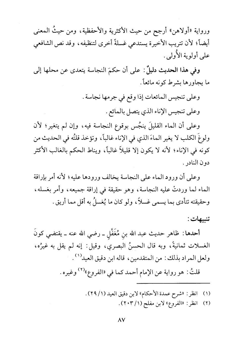 وعلى أن ورود الماء على النجاسة يخالف ورودها عليه؛ لأنه أمر بإراقة الماء لما وردتْ عليه النجاسة، وهو حقيقة في إراقة جميعه، وأمر بغسله، وحقيقته تتأدى بما يسمى غسلاً، ولو كان ما يُغسلُ به أقل مما أريق.