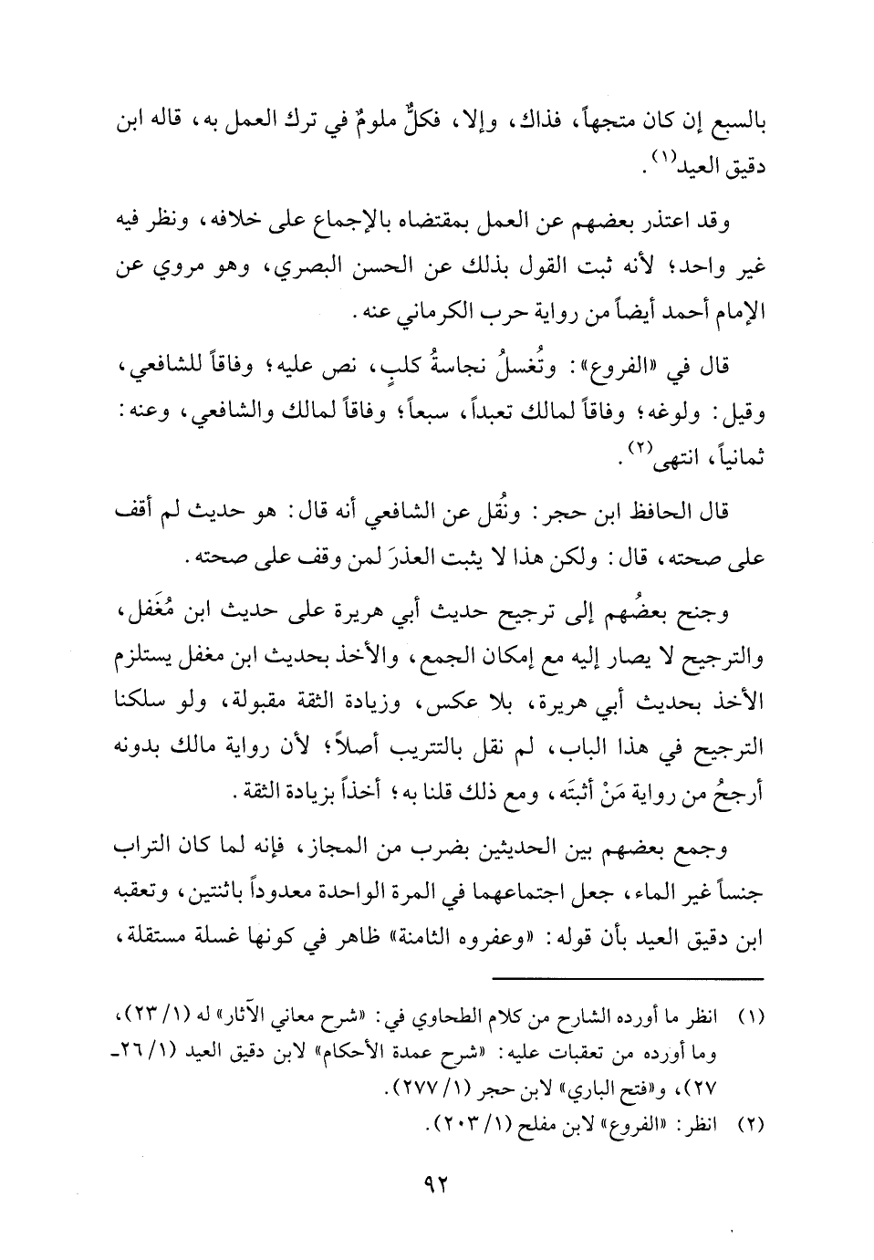 وجنح بعضُهم إلى ترجيح حديث أبي هريرة على حديث ابن مُغَفل، والترجيح لا يصار إليه مع إمكان الجمع، والأخذ بحديث ابن مغفل يستلزم الأخذ بحديث أبي هريرة، بلا عكس، وزيادة الثقة مقبولة، ولو سلكنا الترجيح في هذا الباب، لم نقل بالتتريب أصلاً؛ لأن رواية مالك بدونه أرجحُ من رواية مَنْ أثبتَه، ومع ذلك قلنا به؛ أخذاً بزيادة الثقة.