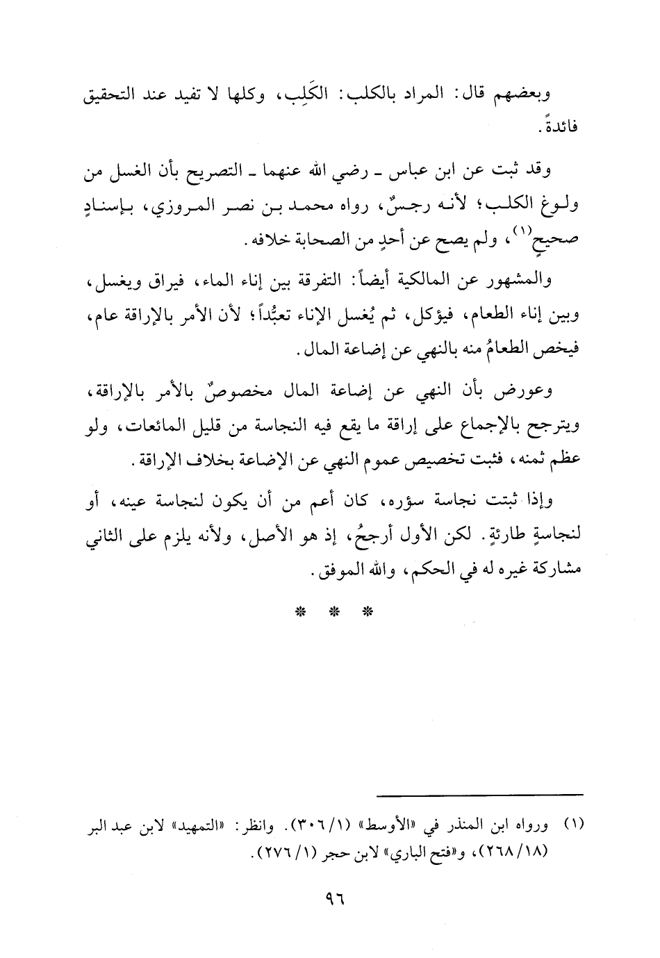 وقد ثبت عن ابن عباس - رضي الله عنهما - التصريح بأن الغسل من ولوغ الكلب؛ لأنه رجسٌ، رواه محمد بن نصر المروزي، بإسنادٍ صحيحٍ (١)، ولم يصح عن أحدٍ من الصحابة خلافه.