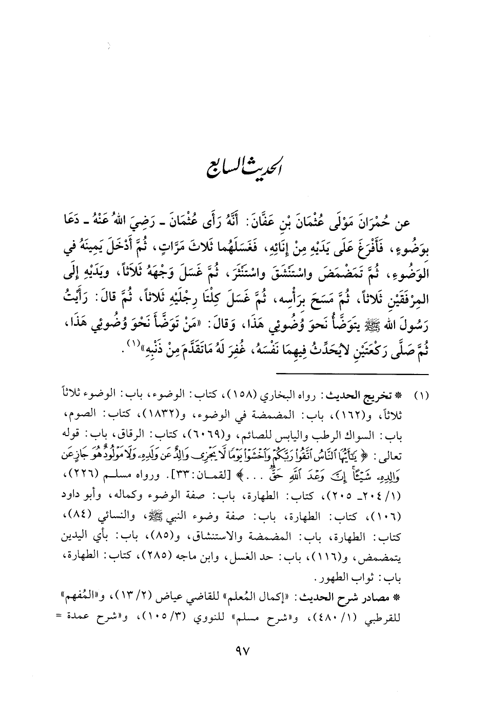 عن حُمْرَانَ مَوْلَى عُثْمَانَ بْنِ عَفَّانَ: أَنَّهُ رَأَى عُثْمَانَ - رَضِيَ اللهُ عَنْهُ - دَعَا بِوَضُوءٍ، فَأَفْرَغَ عَلَى يَدَيْهِ مِنْ إِنَائِهِ، فَغَسَلَهُما ثَلاثَ مَرَّاتٍ، ثُمَّ أَدْخَلَ يَمِينَهُ في الوَضُوءِ، ثُمَّ تَمَضْمَضَ واسْتَنْشَقَ واسْتَنْثَرَ، ثُمَّ غَسَلَ وَجْهَهُ ثَلاَثاً، ويَدَيْهِ إِلَى المِرْفَقَيْنِ ثَلاثاً، ثُمَّ مَسَحَ بِرَأْسِه، ثُمَّ غَسَلَ كِلْتَا رِجْلَيْهِ ثَلاثاً، ثُمَّ قالَ: رَأَيْتُ رَسُولَ الله - صلى الله عليه وسلم - يتَوَضَّأُ نَحوَ وُضُوئِي هَذَا، وَقالَ: "مَنْ تَوَضَّأَ نَحْوَ وُضُوئِي هَذَا، ثُمَّ صَلَّى رَكْعَتَيْنِ لا يُحَدِّثُ فِيهِمَا نَفْسَهُ، غُفِرَ لَهُ مَا تَقَدَّمَ مِنْ ذَنْبِهِ" (١).