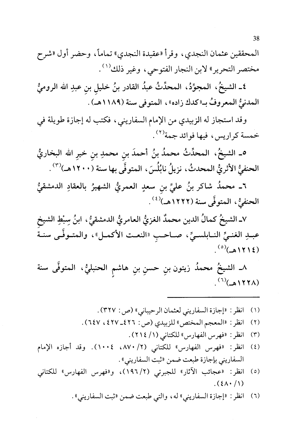 وقد استجاز له الزبيدي من الإمام السفاريني، فكتب له إجازة طويلة في خمسة كراريس، فيها فوائد جمة (٢).