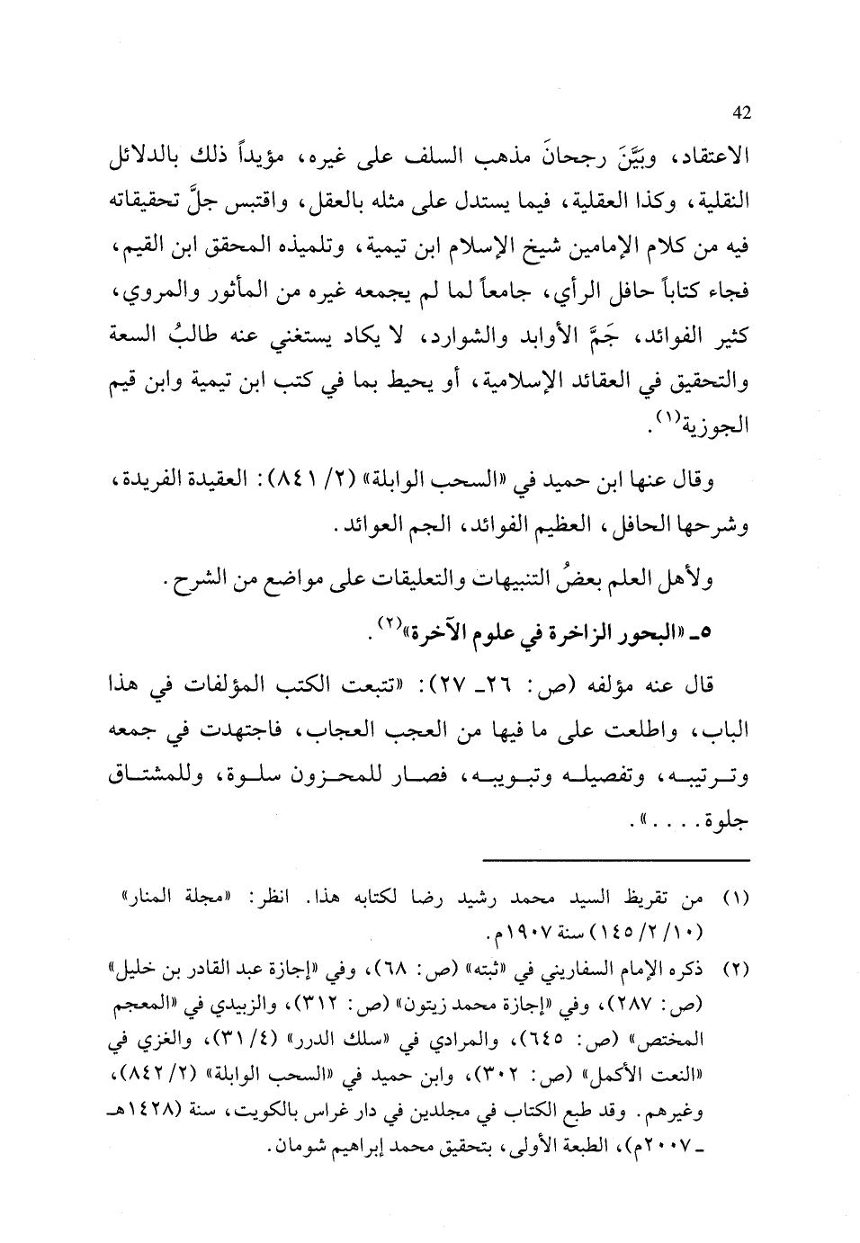 الاعتقاد، وبَيَّنَ رجحانَ مذهب السلف على غيره، مؤيداً ذلك بالدلائل النقلية، وكذا العقلية، فيما يستدل على مثله بالعقل، واقتبس جلَّ تحقيقاته فيه من كلام الإمامين شيخ الإِسلام ابن تيمية، وتلميذه المحقق ابن القيم، فجاء كتاباً حافل الرأي، جامعاً لما لم يجمعه غيره من المأثور والمروي، كثير الفوائد، جَمَّ الأوابد والشوارد، لا يكاد يستغني عنه طالبُ السعة والتحقيق في العقائد الإِسلامية، أو يحيط بما في كتب ابن تيمية وابن قيم الجوزية (١).
