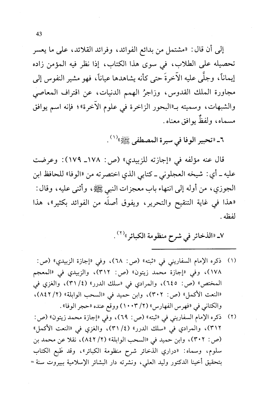 (٢) ذكره الإمام السفاريني في "ثبته" (ص: ٦٩)، وفي "إجازة محمد زيتون" (ص: ٣١٢)، والمرادي في "سلك الدرر" (٤/ ٣١)، والغزي في "النعت الأكمل" (ص: ٣٠٢)، وابن حميد في "السحب الوابلة" (٢/ ٨٤٢)، نقلا عن محمد بن سلوم، وسماه: "دراري الذخائر شرح منظومة الكبائر"، وقد طبع الكتاب بتحقيق أخينا الدكتور وليد العلي، ونشرته دار البشائر الإِسلامية ببيروت سنة =