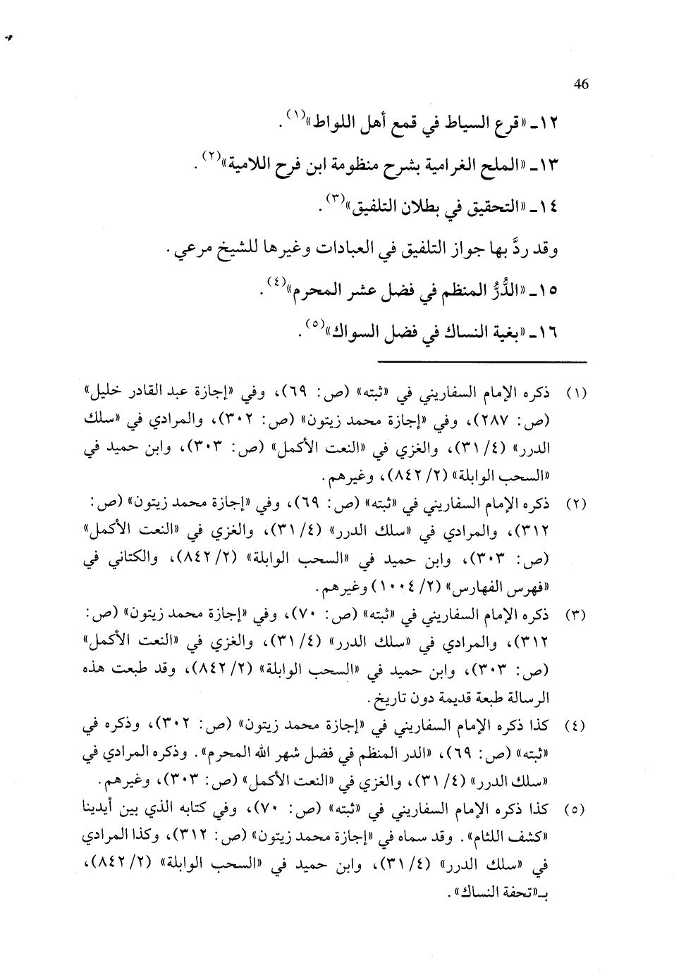(٤) كذا ذكره الإمام السفاريني في "إجازة محمد زيتون" (ص: ٣٠٢)، وذكره في "ثبته" (ص: ٦٩)، "الدر المنظم في فضل شهر الله المحرم". وذكره المرادي في "سلك الدرر" (٤/ ٣١)، والغزي في "النعت الأكمل" (ص: ٣٠٣)، وغيرهم.