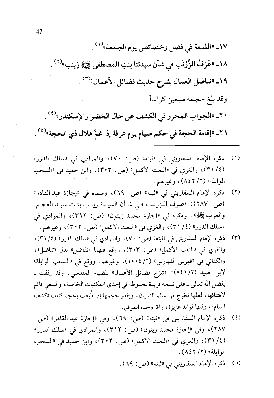 (٢) ذكره الإمام السفاريني في "ثبته" (ص: ٦٩)، وسماه في "إجازة عبد القادر" (ص: ٢٨٧): "عرف الزرنب في شأن السيدة زينب بنت سيد العجم والعرب - صلى الله عليه وسلم - ". وذكره في "إجازة محمد زيتون" (ص: ٣١٢)، والمرادي في "سلك الدرر" (٤/ ٣١)، والغزي في "النعت الأكمل" (ص: ٣٠٢)، وغيرهم.