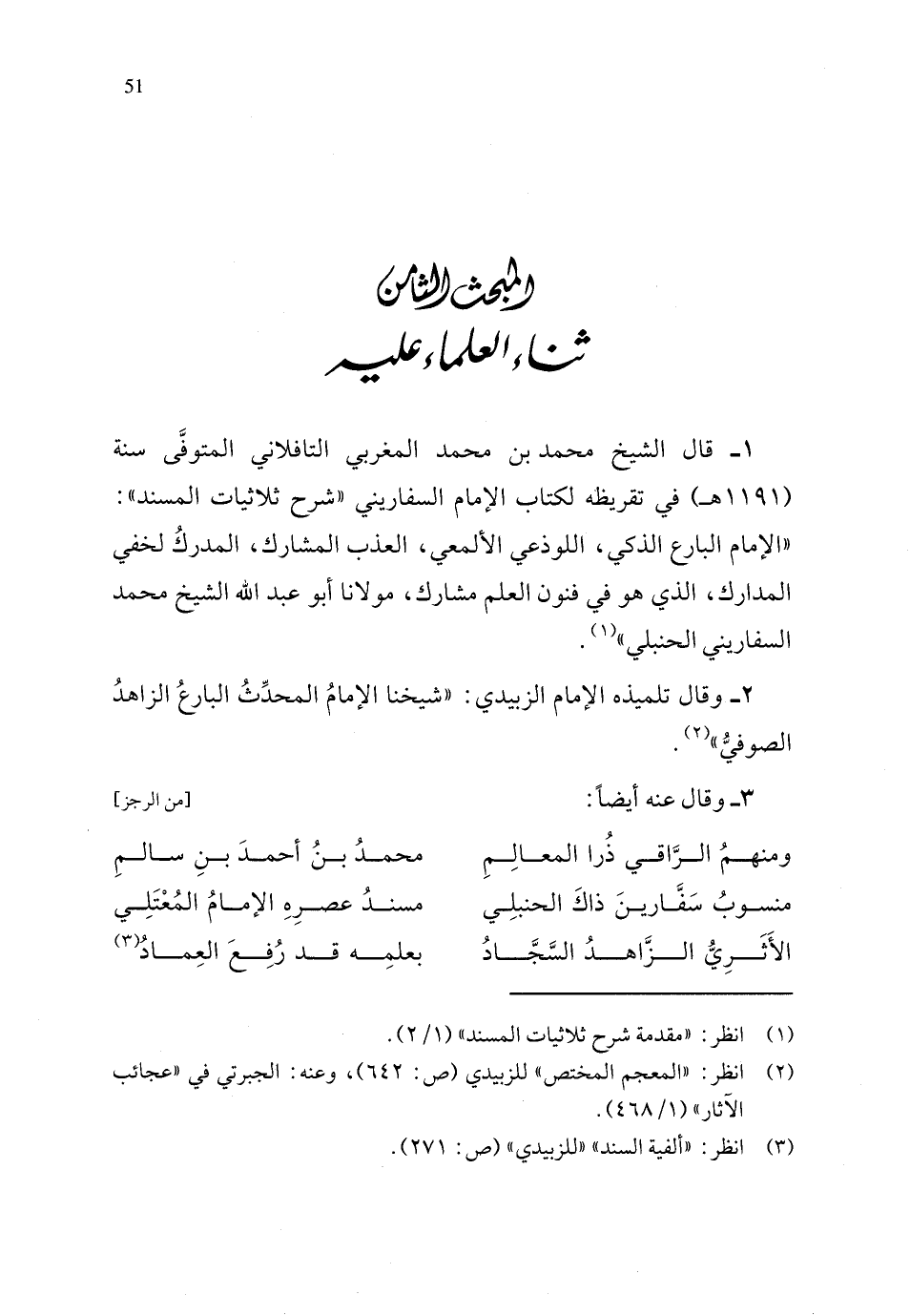 ١ - قال الشيخ محمد بن محمد المغربي التافلاني المتوفَّى سنة (١١٩١ هـ) في تقريظه لكتاب الإمام السفاريني "شرح ثلاثيات المسند": "الإمام البارع الذكي، اللوذعي الألمعي، العذب المشارك، المدركُ لخفي المدارك، الذي هو في فنون العلم مشارك، مولانا أبو عبد الله الشيخ محمد السفاريني الحنبلي" (١).