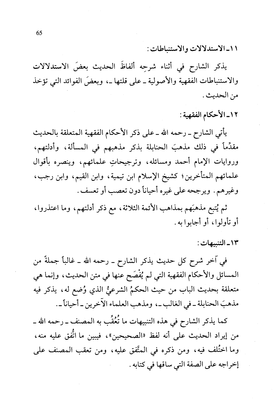 في آخر شرح كل حديث يذكر الشارح -رحمه الله- غالباً جملةً من المسائل والأحكام الفقهية التي لم يُفْصَح عنها في متن الحديث، وإنما هي متعلقة بحديث الباب من حيث الحكمُ الشرعيُّ الذي وُضع له، يذكر فيه مذهبَ الحنابلة -في الغالب-، ومذهب العلماء الآخرين -أحياناً-.