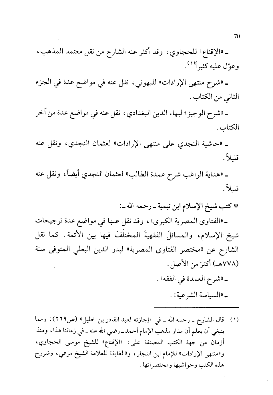 - "الفتاوى المصرية الكبرى"، وقد نقل عنها في مواضع عدة ترجيحات شيخ الإِسلام، والمسائلَ الفقهيةَ المختلَفَ فيها بين الأئمة. كانقل الشارح عن "مختصر الفتاوى المصرية" لبدر الدين البعلي المتوفى سنة (٧٧٨ هـ) أكثرَ من الأصل.
