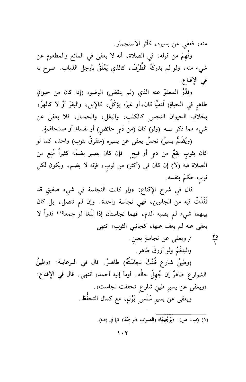 وفُهِمَ من قوله: في الصلاة، أنه لا يعفى في المائع والمطعوم عن شيء منه، ولو لم يدركْهُ الطَّرْف، كالذي يَعْلَقُ بأرجل الذباب. صرح به في الإِقناع.