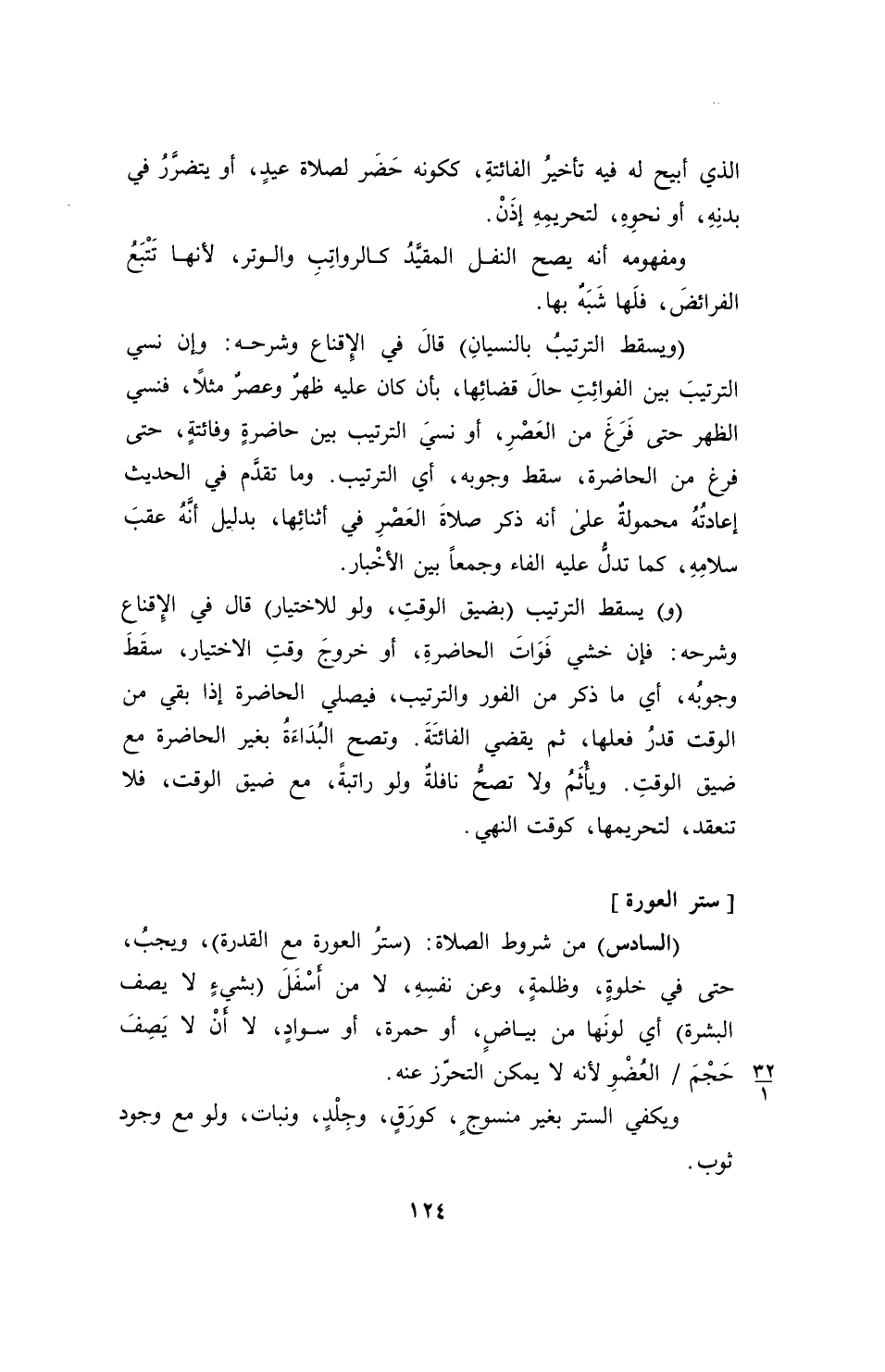 (ويسقط الترتيبُ بالنسيانِ) قالَ في الإِقناع وشرحه: وإن نسي الترتيبَ بين الفوائِتِ حالَ قضائِها، بأن كان عليه ظهرٌ وعصرٌ مثلاً، فنسي الظهر حتى فَرَغَ من العَصْرِ، أو نسيَ الترتيب بين حاضرةٍ وفائتةٍ، حتى فرغ من الحاضرة، سقط وجوبه، أي الترتيب. وما تقدَّم في الحديث إعادتُهُ محمولةٌ على أنه ذكر صلاةَ العَصْرِ في أثنائِها، بدليل أنَّهُ عقبَ سلامِهِ، كما تدلُّ عليه الفاء وجمعاً بين الأخْبار.