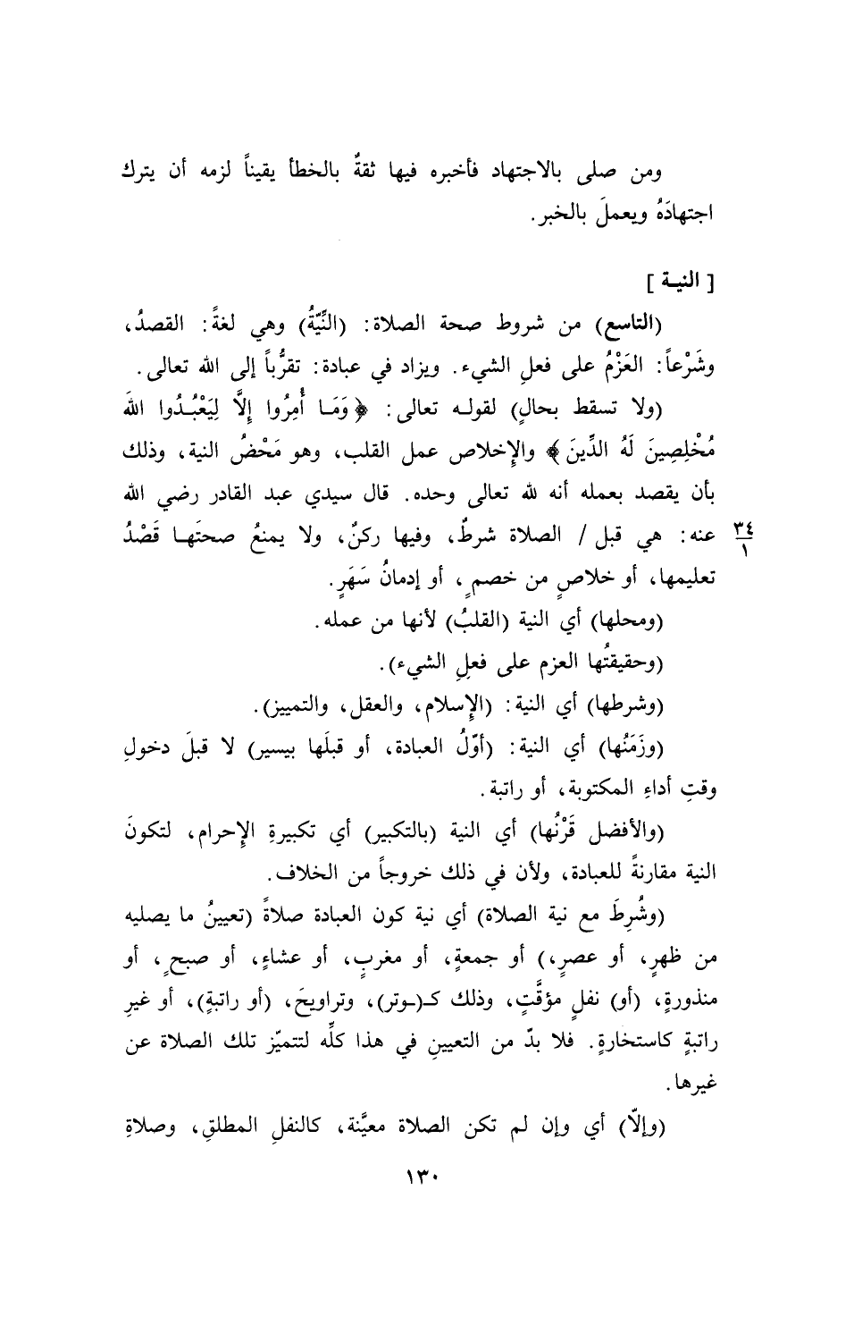 (ولا تسقط بحالٍ) لقوله تعالى: {وَمَا أُمِرُوا إِلَّا لِيَعْبُدُوا اللَّهَ مُخْلِصِينَ لَهُ الدِّينَ} والإِخلاص عمل القلب، وهو مَحْضُ النية، وذلك بأن يقصد بعمله أنه لله تعالى وحده. قال سيدي عبد القادر رضي الله عنه: هي قبل الصلاة شرطٌ، وفيها ركنٌ، ولا يمنعُ صحتَها قَصْدُ تعليمها، أو خلاصٍ من خصمٍ، أو إدمانُ سَهَرٍ.