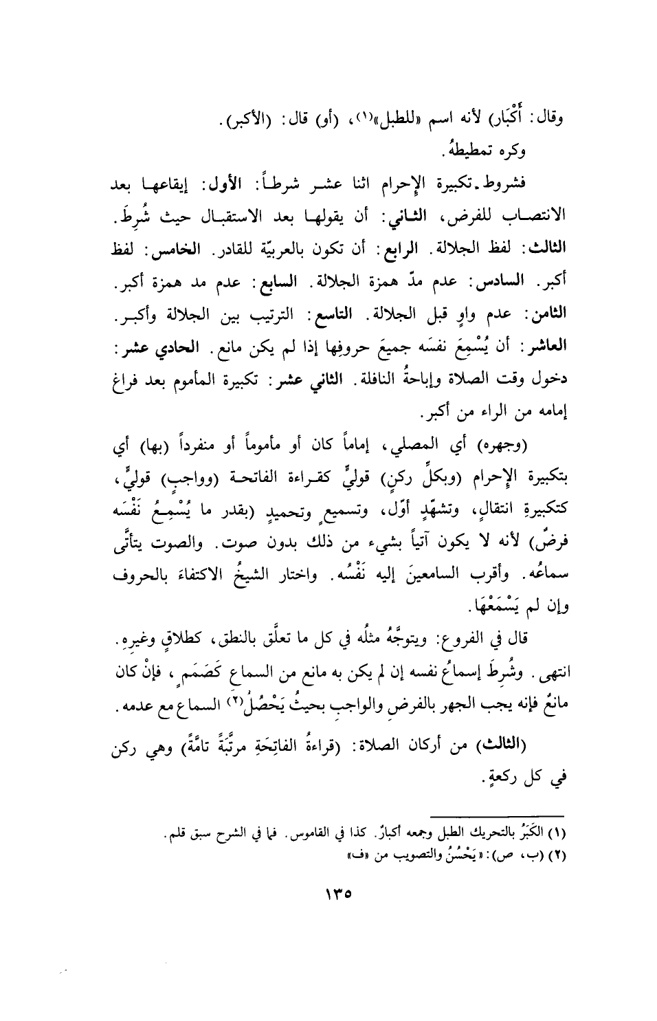 فشروط تكبيرة الإِحرام اثنا عشر شرطاً: الأول: إيقاعها بعد الانتصاب للفرض، الثاني: أن يقولها بعد الاستقبال حيث شُرِطَ. الثالث: لفظ الجلالة. الرابع: أن تكون بالعربيّة للقادر. الخامس: لفظ أكبر. السادس: عدم مدّ همزة الجلالة. السابع: عدم مد همزة أكبر. الثامن: عدم واوٍ قبل الجلالة. التاسع: الترتيب بين الجلالة وأكبر. العاشر: أن يُسْمِعَ نفسَه جميعَ حروفِها إذا لم يكن مانع. الحادي عشر: دخول وقت الصلاة وإباحةُ النافلة. الثاني عشر: تكبيرة المأموم بعد فراغ إمامه من الراء من أكبر.