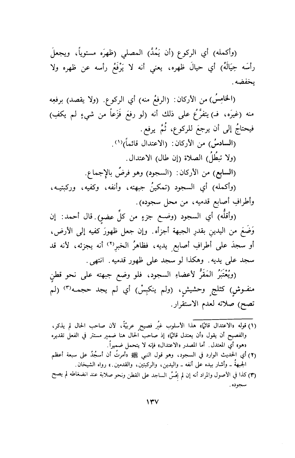 (¬2) أي الحديث الوارد في السجود، وهو قول النبي - صلى الله عليه وسلم - "أمرتُ أن أسجُدُ على سبعة أعظم الجبهةُ -وأشار بيده على أنفه- واليدين، والركبتين، والقدمين" رواه الشيخان.