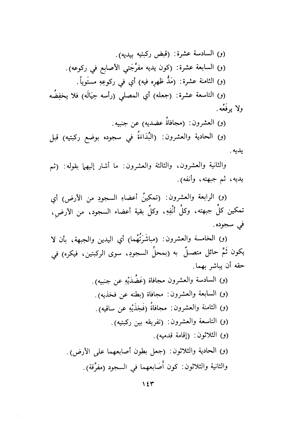 (و) العشرون: (مجافاةُ عضديه) عن جنبيه.