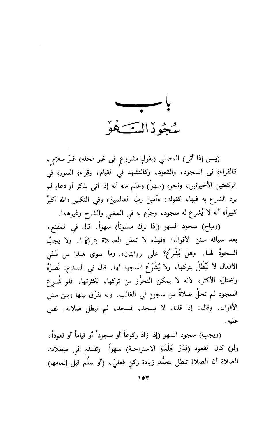(ويباح) سجود السهو (إذا ترك مسنوناً) سهواً. قال في المقنع، بعد سياقه سنن الأقوال: "فهذه لا تبطل الصلاة بتركِهَا. ولا يجبُ السجودُ لها. وهل يُشْرَع؟ على روايتين". وما سوى هذا من سُنَنِ الأفعال لا تَبْطُلُ بتركها، ولا يُشْرَع السجود لها. قال في المبدع: نَصَرَهُ واختارَه الأكثر، لأنه لا يمكن التحرُّز من تركها، لكثرتها، فلو شُرِع السجود لم تخلُ صلاةٌ من سجودٍ في الغالب. وبه يفرّق بينها وبين سنن الأقوال. وقال: إذا قلنا: لا يسجد، فسجد، لم تبطل صلاته. نص عليه.