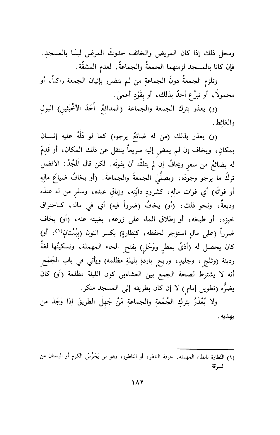(و) يعذر بذلك (من له ضائعٌ يرجوه) كما لو دَلَّهُ عليه إنسان بمكانٍ، ويخاف إن لم يمضِ إليه سريعاً ينتقل عن ذلك المكان، أو قَدِمَ له بضائعُ من سفرٍ ويخافُ إن لم يتلقَّه أن يفوتَه. لكن قال المجْدُ: الأفضل تركُ ما يرجو وجوده، ويصلَّيَ الجمعةَ والجماعةَ. (أو يخافُ ضياعَ مالِهِ أو فواتَه) أي ذوات مالِهِ، كشرودِ دابّتِهِ، وإباقِ عبده، وسفرِ من له عندَه وديعةٌ، ونحو ذلك، (أو) يخافُ (ضرراً فيه) أي في ماله، كاحتراق خبزه، أو طبخه، أو إطلاق الماء على زرعه، بغيبته عنه، (أو) يخاف ضرراً (على مالٍ استؤجر لحفظه، كنِطارةٍ) بكسر النون (بِبُسْتانٍ (¬1)، أو) كان يحصل له (أذىً بمطرٍ ووَحَلٍ) بفتحِ الحاء المهملة، وتسكينها لغةٌ رديئة (وثلجٍ، وجليدٍ، وريحٍ باردةٍ بليلةٍ مظلمة) ويأتي في باب الجَمْعِ أنه لا يشترط لصحة الجمع بين العشاءين كون الليلة مظلمة (أو) كان يضرُّه (تطويل إمامٍ) لا إن كان بطريقه إلى المسجد منكر.