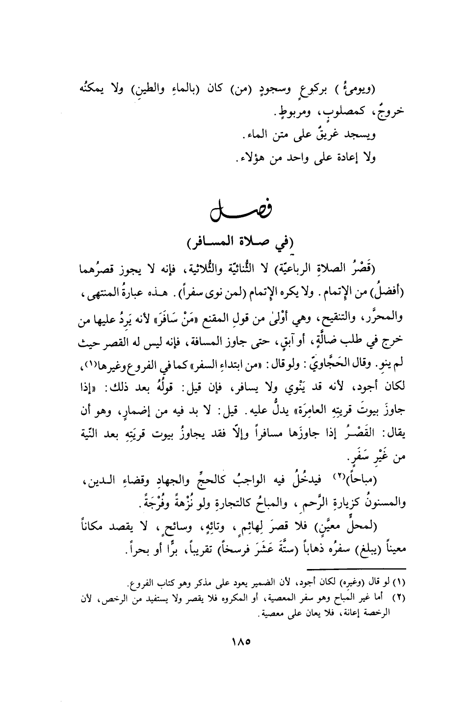 (قَصْرُ الصلاةِ الرباعيّة) لا الثُّنائيّة والثُّلاثية، فإنه لا يجوز قصرُهما (أفضلُ) من الإِتمام. ولا يكره الإِتمام (لمن نوى سفراً). هذه عبارةُ المنتهى، والمحرَّر، والتنقيح، وهي أوْلى من قولِ المقنع "مَنْ سَافَرَ" لأنه يَرِدُ عليها من خرج في طلب ضالَّةٍ، أو آبقٍ، حتى جاوز المسافة، فإنه ليس له القصر حيث لم ينوِ. وقال الحَجَّاويّ: ولو قال: "من ابتداءِ السفر" كما في الفروع وغيرها (¬1)، لكان أجود، لأنه قد يَنْوي ولا يسافر، فإن قيل: قولُهُ بعد ذلك: "إذا جاوزَ بيوتَ قريتِهِ العامِرَة" يدلُّ عليه. قيل: لا بد فيه من إضمارٍ، وهو أن يقال: القَصْرُ إذا جاوزَها مسافراً وإلاَّ فقد يجاوزُ بيوت قريَتِهِ بعد النّية من غَيْرِ سَفَرٍ.