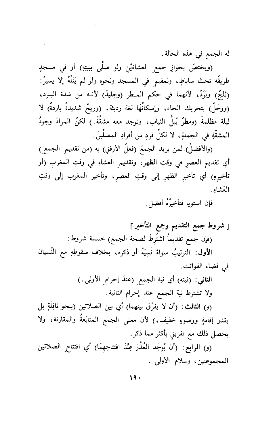 (ويختصّ بجوازِ جمعِ العشاءَيْنِ ولو صلَّى ببيتِهِ) أو في مسجدٍ طريقُه تحتَ ساباطٍ، ولمقيمٍ في المسجد ونحوه ولو لم يَنَلْهُ إلا يسيرٌ: (ثلجٌ) وبَرَدٌ، لأنهما في حكم المطر (وجليدٌ) لأنه من شدة البرد، (ووحَلٌ) بتحريك الحاء، وإسكانُهَا لغة رديئة، (وريحٌ شديدةٌ باردةٌ) لا ليلة مظلمةً (ومطرٌ يُبلُّ الثياب، وتوجد معه مشقَّةٌ.) لكنّ المرادَ وجودُ المشقّةِ في الجملةٍ، لا لكلِّ فردٍ من أفرادِ المصلِّينَ.