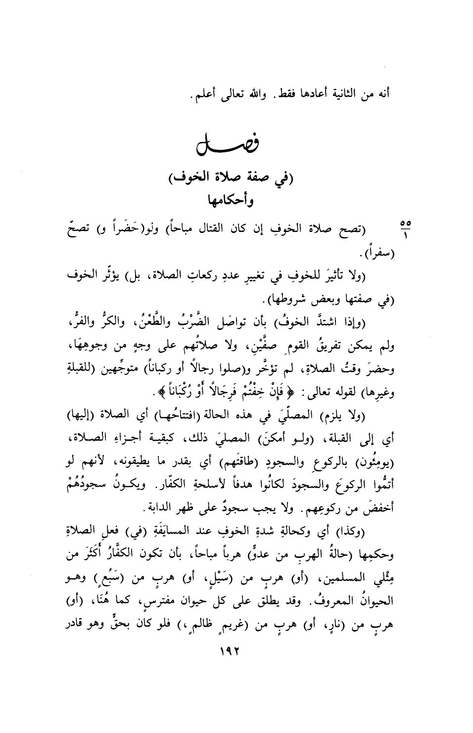 (وإذا اشتدَّ الخوف) بِأن تواصَل الضَّرْبُ والطَّعْنُ، والكرُّ والفرُّ، ولم يمكن تفريقُ القومِ صفَّيْنِ، ولا صلاتُهم على وجهٍ من وجوهِهَا، وحضرَ وقتُ الصلاةِ، لم تؤخَّر و (صلوا رجالاً أو ركباناً) متوجِّهين (للقبلةِ وغيرِها) لقوله تعالى: {فَإِنْ خِفْتُمْ فَرِجَالاً أَوْ رُكْبَانًا}.
