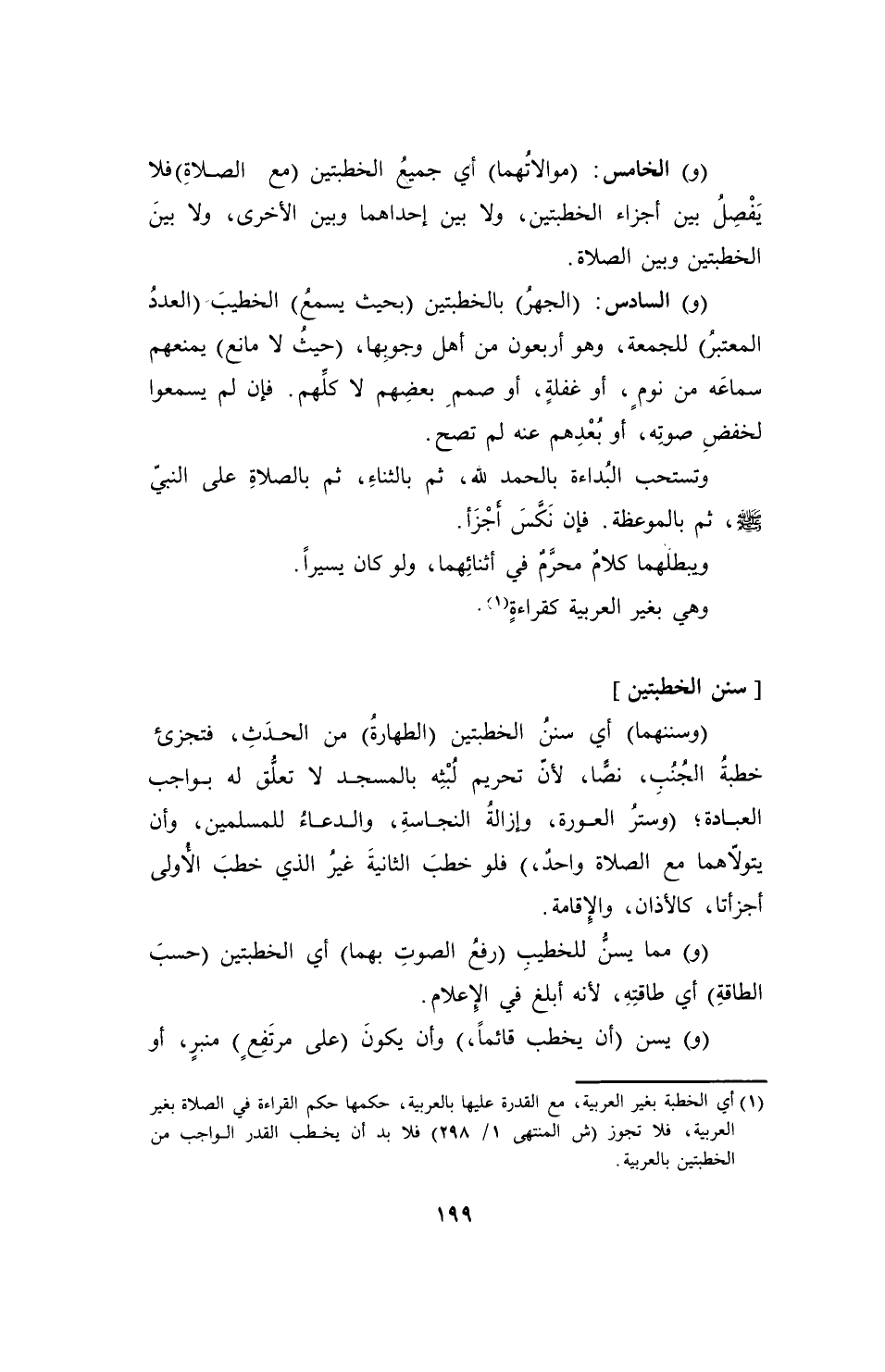 (¬1) أي الخطبة بغير العربية، مع القدرة عليها بالعربية، حكمها حكم القراءة في الصلاة بغير العربية، فلا تجوز (ش المنتهى 1/ 298) فلا بد أن يخطب القدر الواجب من الخطبتين بالعربية.
