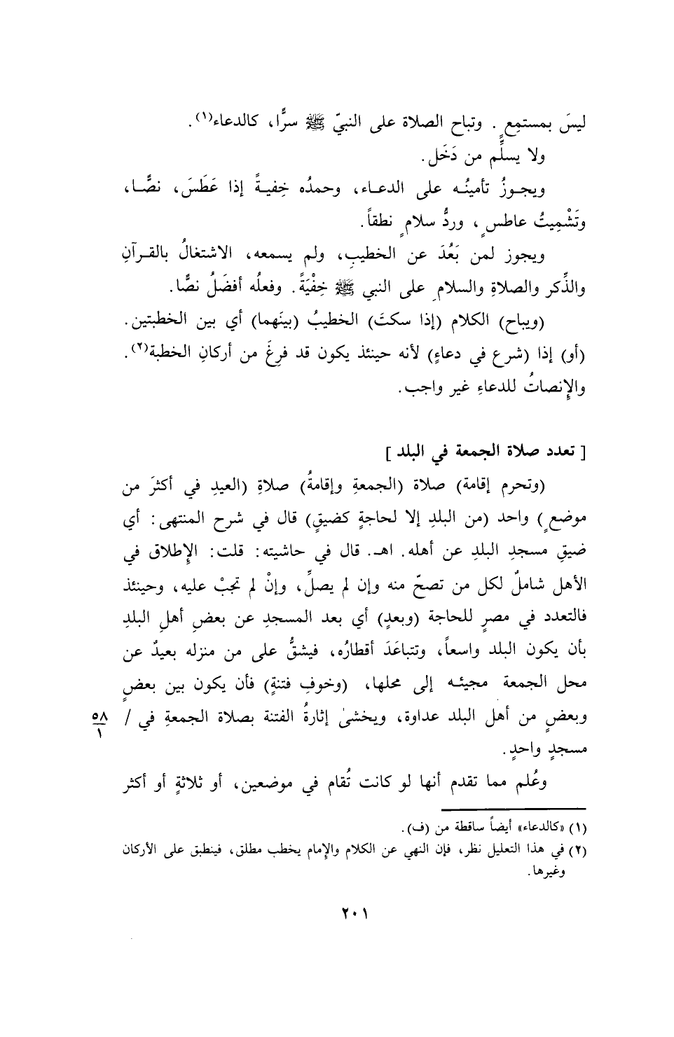 (¬2) في هذا التعليل نظر، فإن النهي عن الكلام والإِمام يخطب مطلق، فينطبق على الأركان وغيرها.