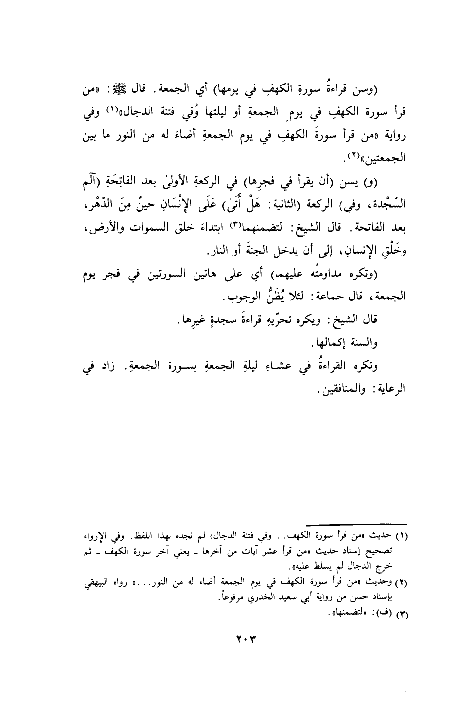 (¬2) وحديث "من قرأ سورة الكهف في يوم الجمعة أضاء له من النور ... " رواه البيهقي بإسناد حسن من رواية أبي سعيد الخدري مرفوعاً.